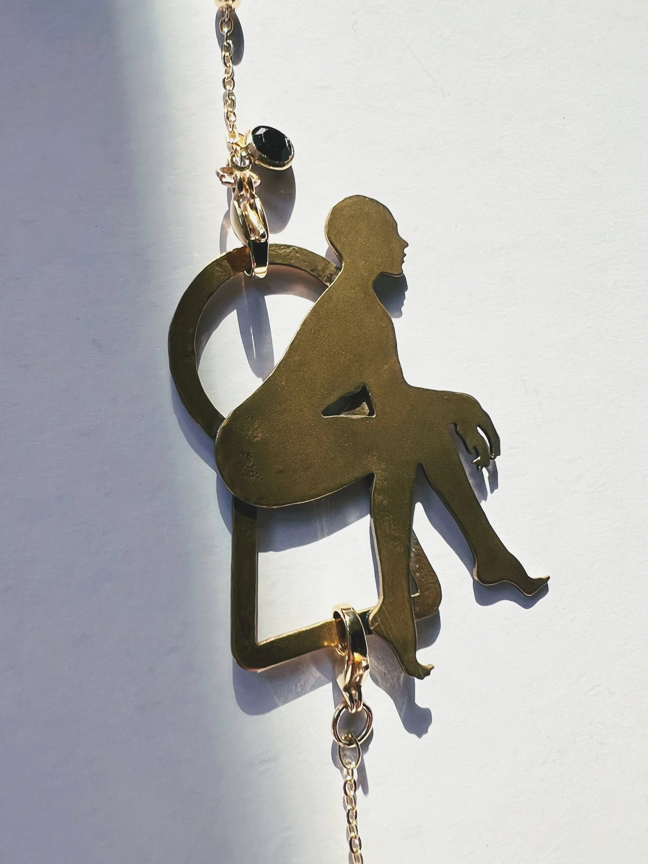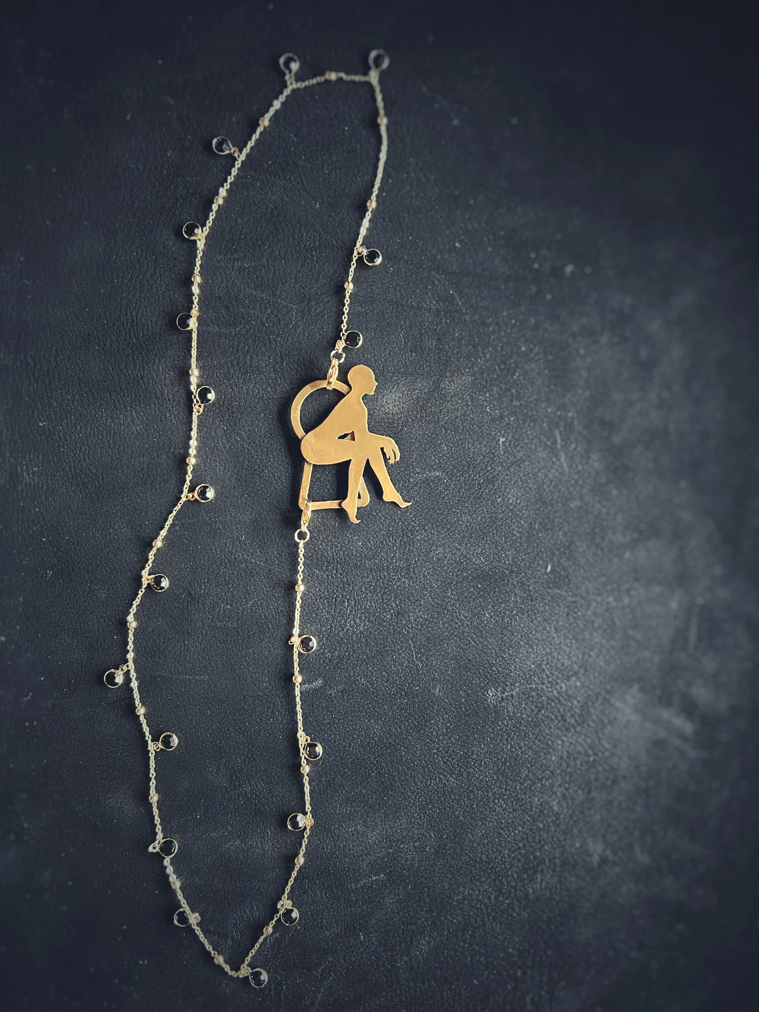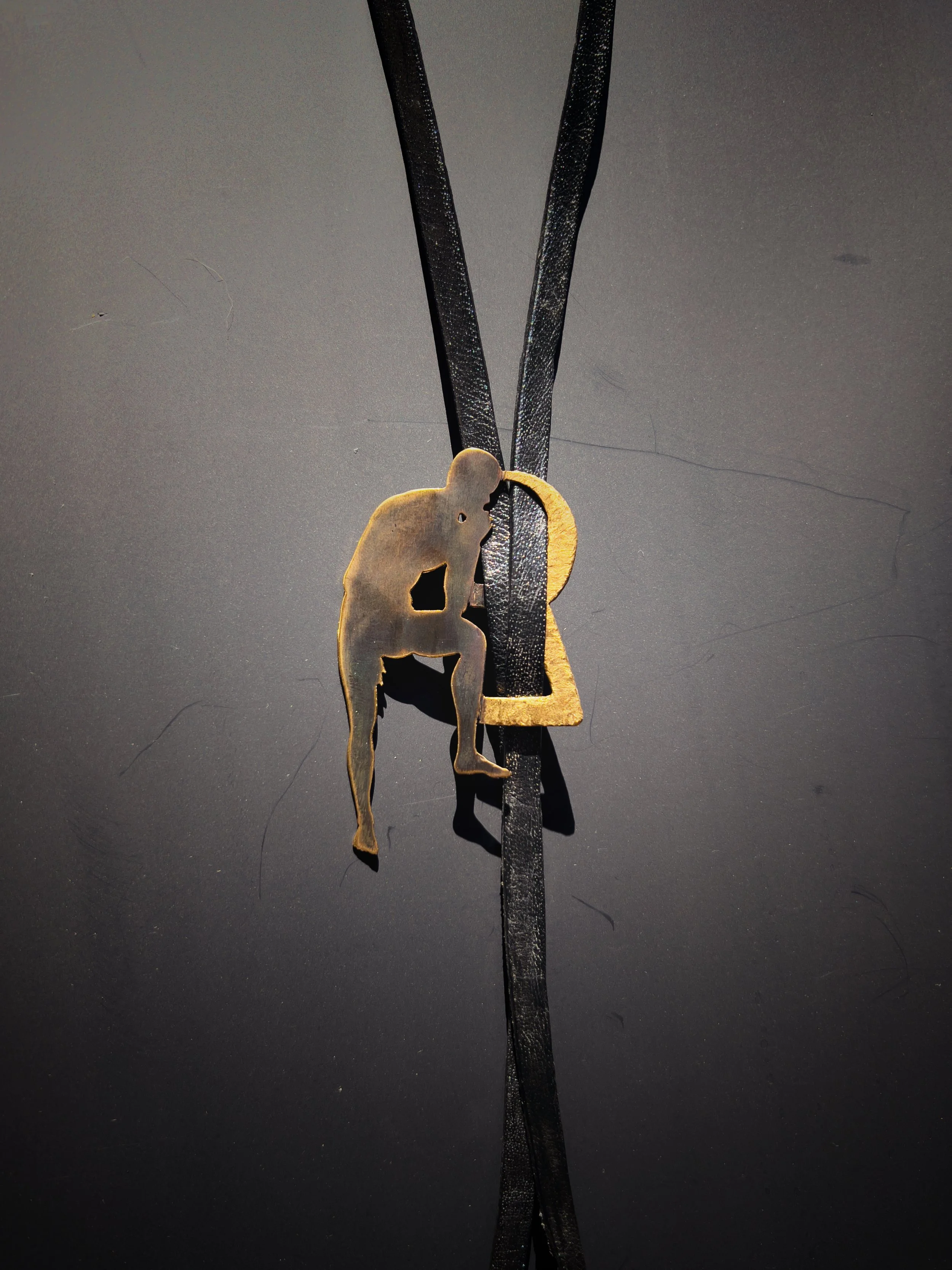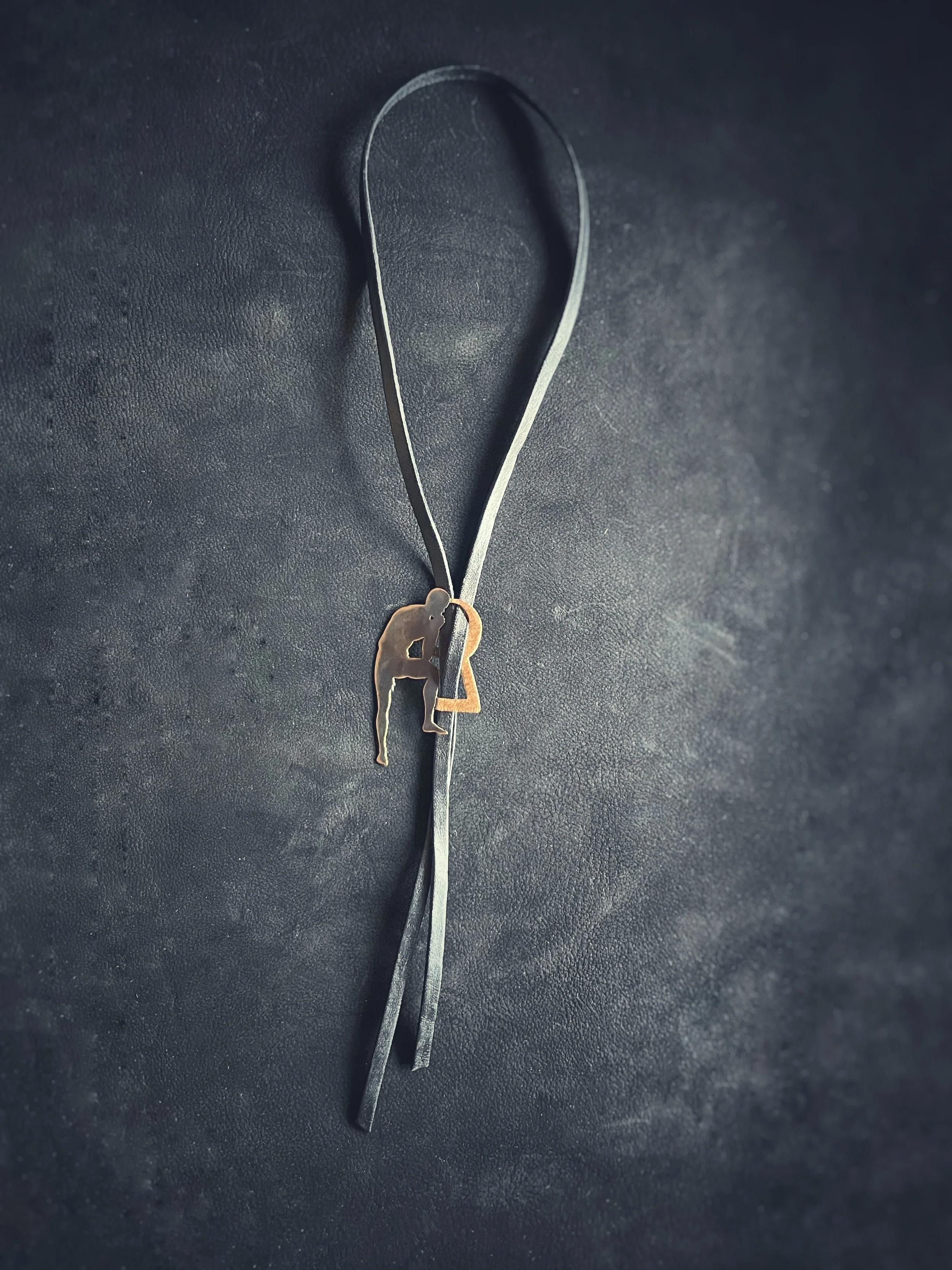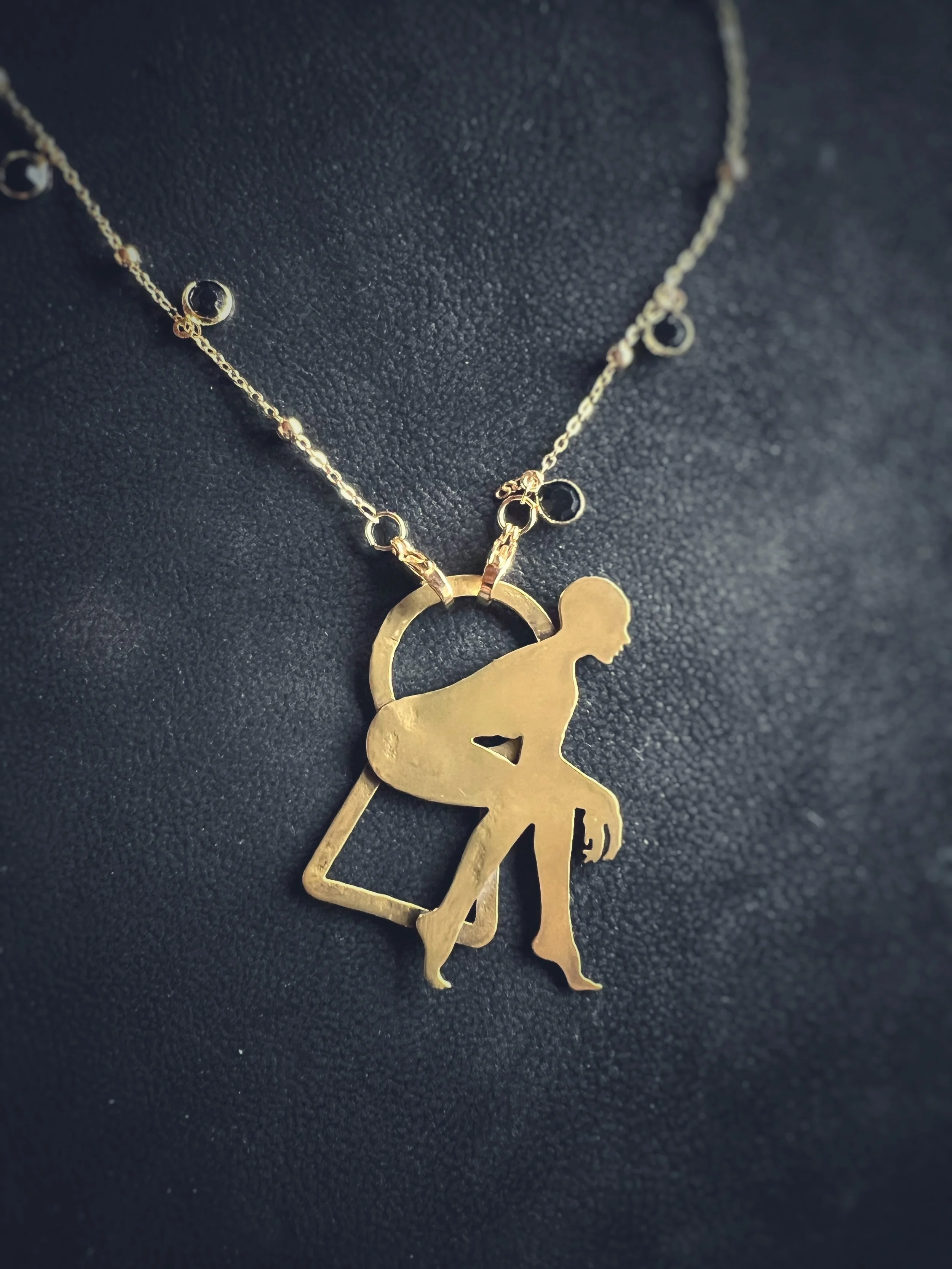Each figure is hand-pierced, refined, and set into a composition of brass, silver, upcycled leather or dark crystals.