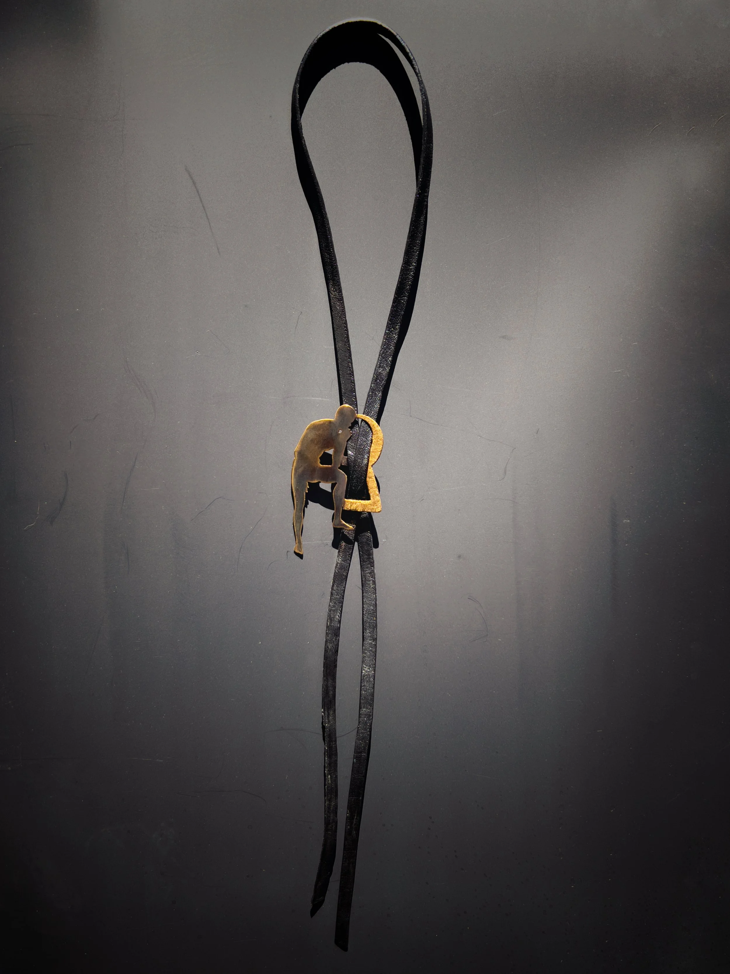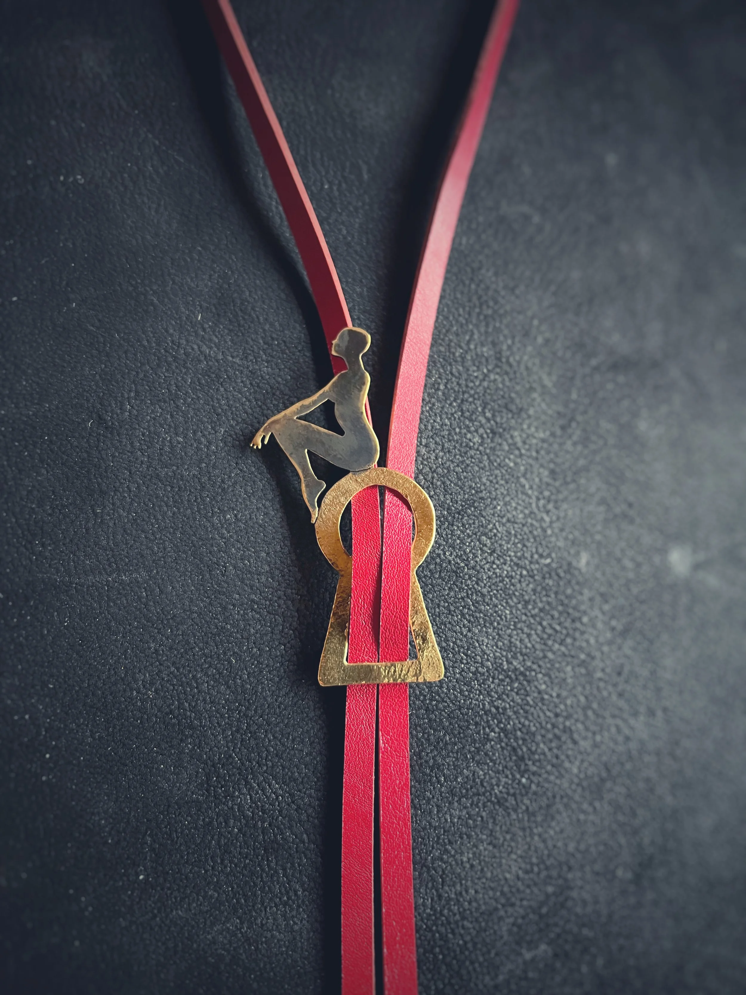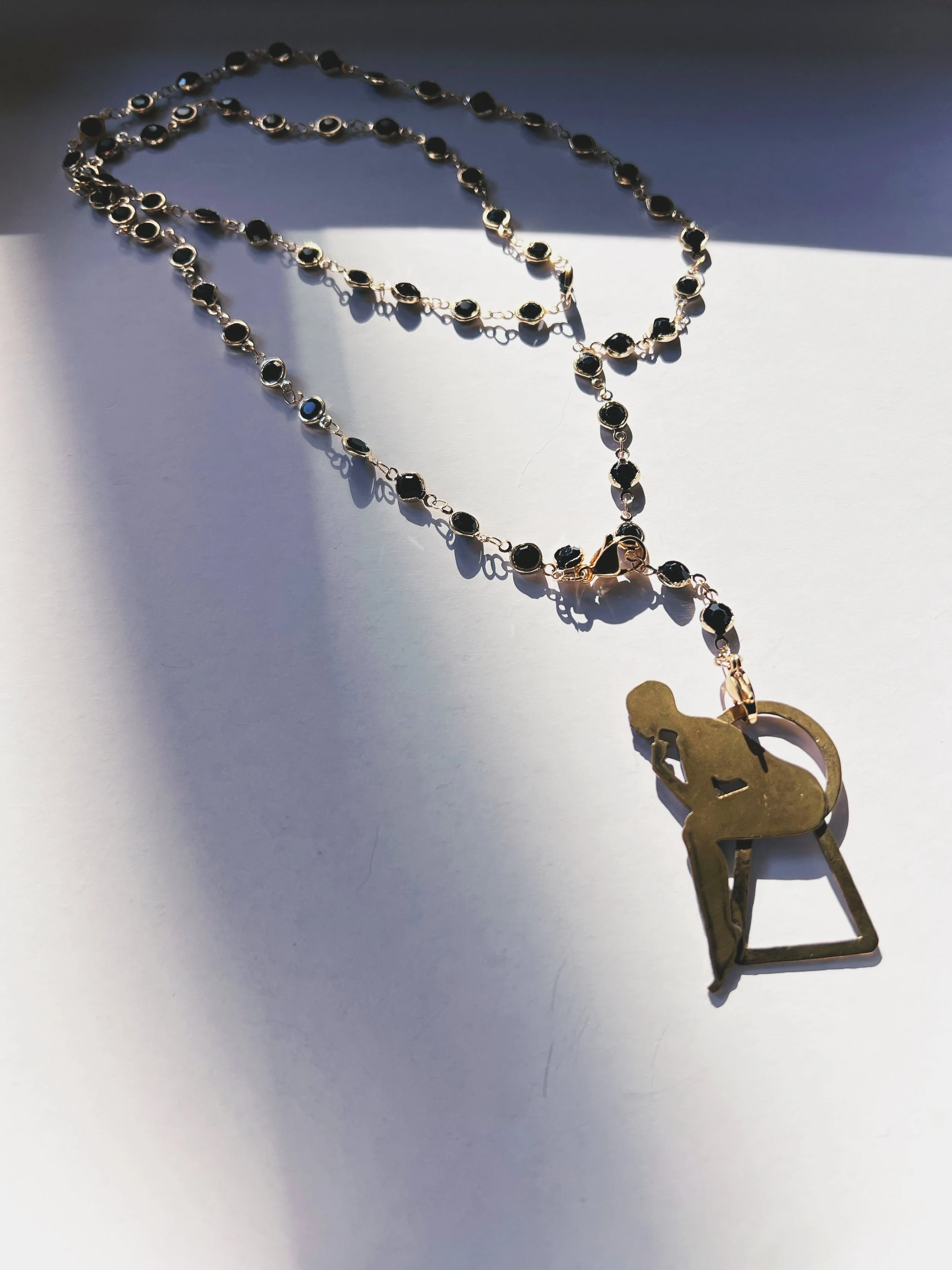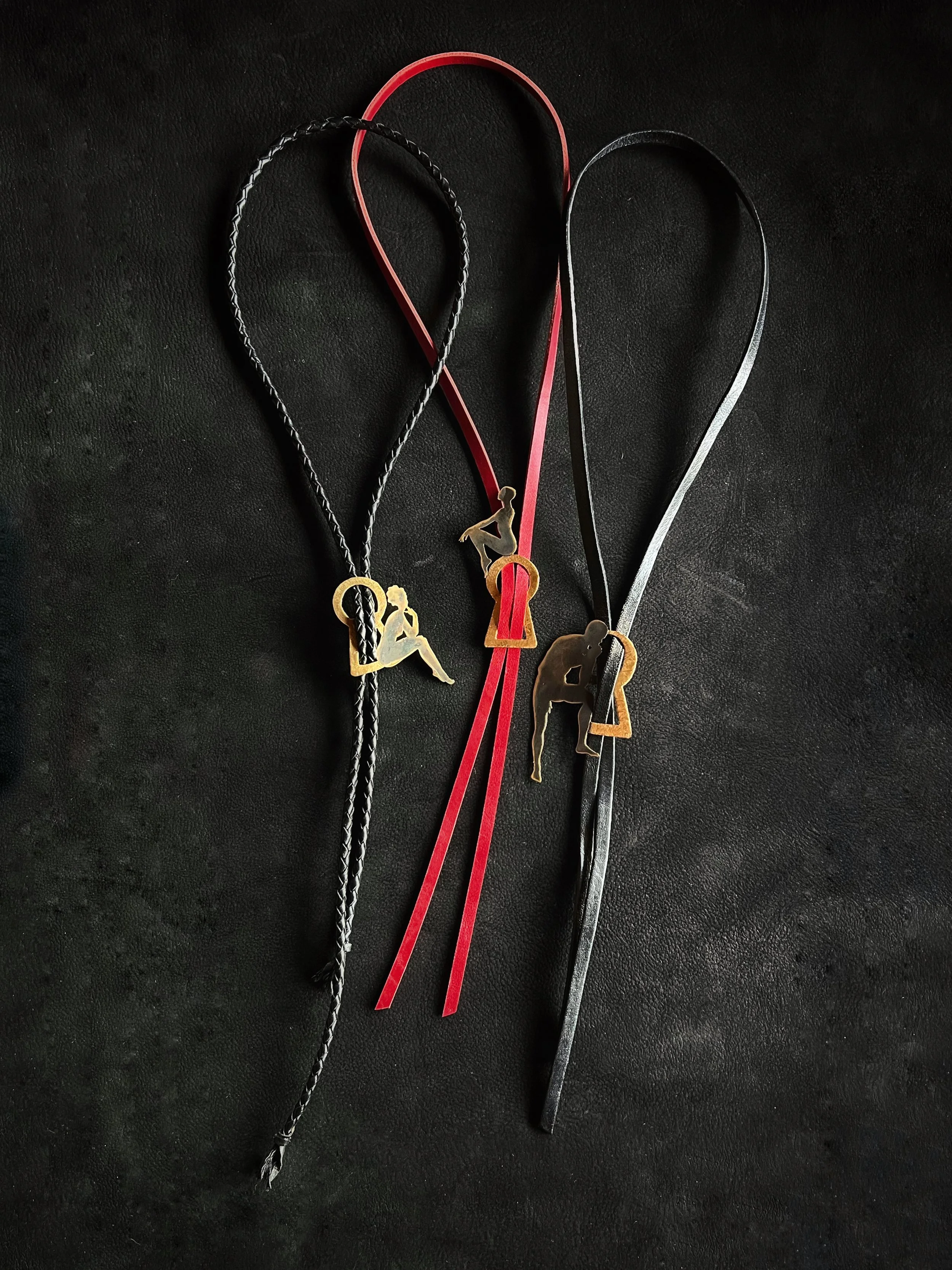 Each figure is hand-pierced, refined, and set into a composition of brass, silver, upcycled leather or dark crystals.