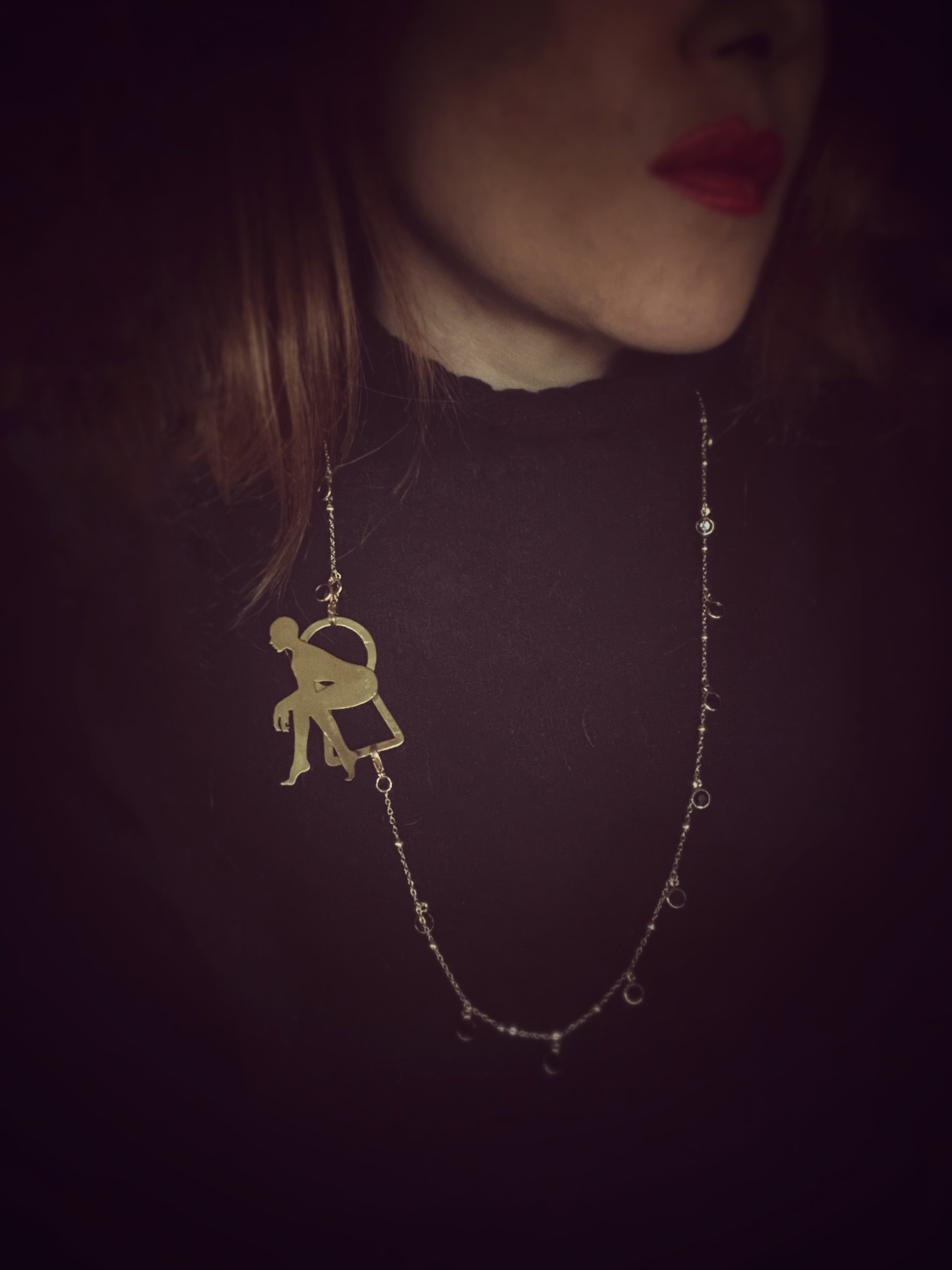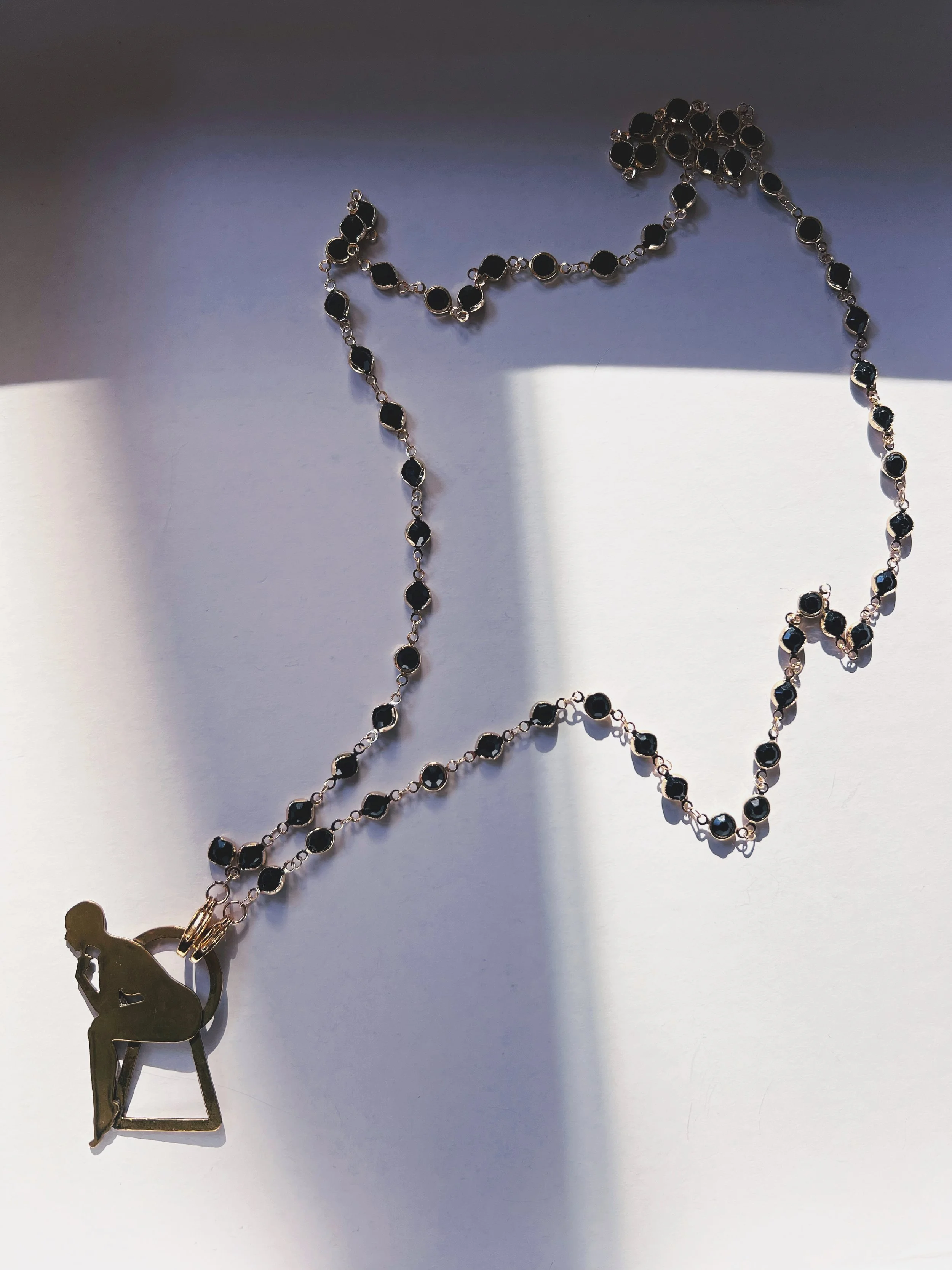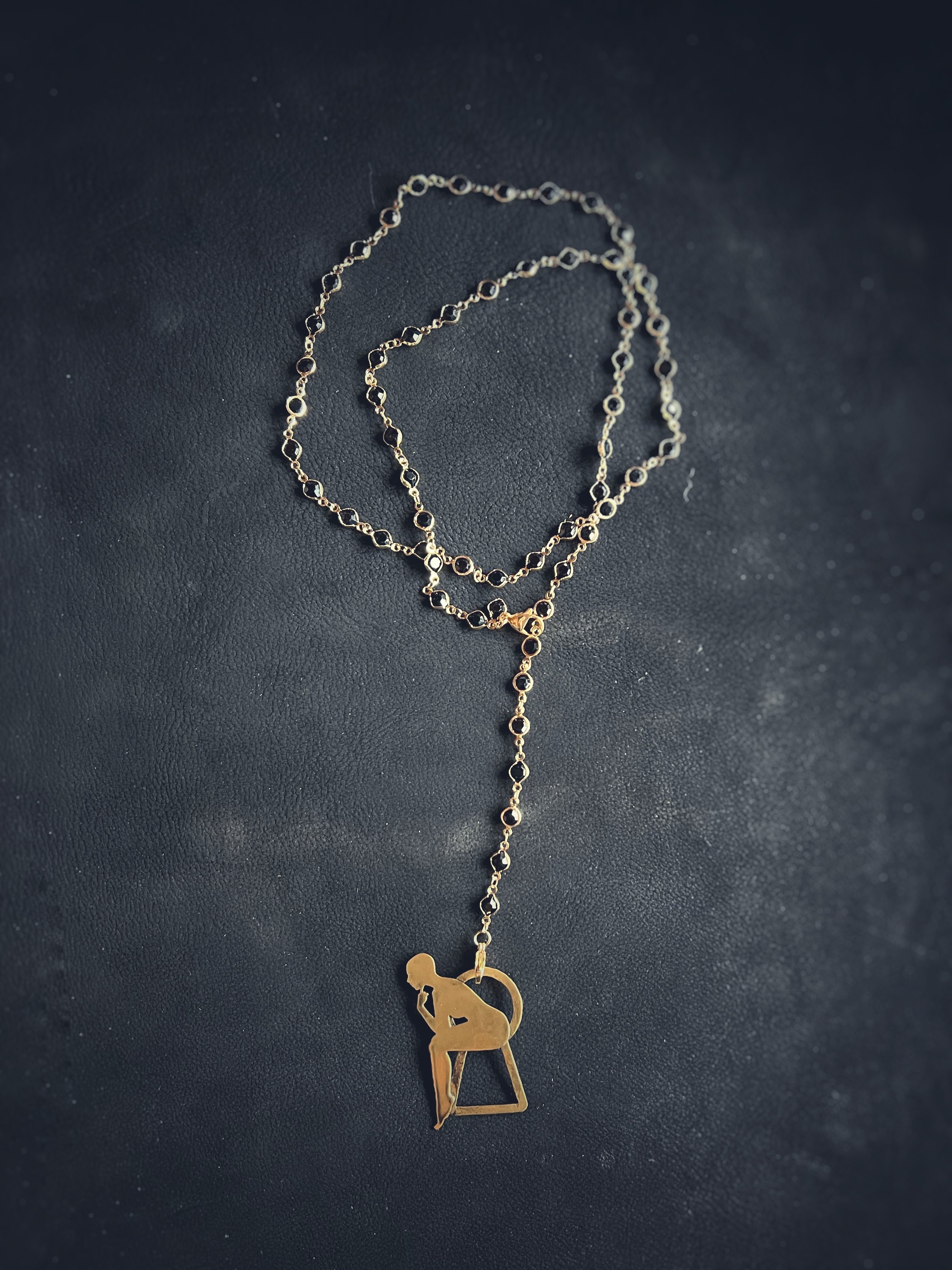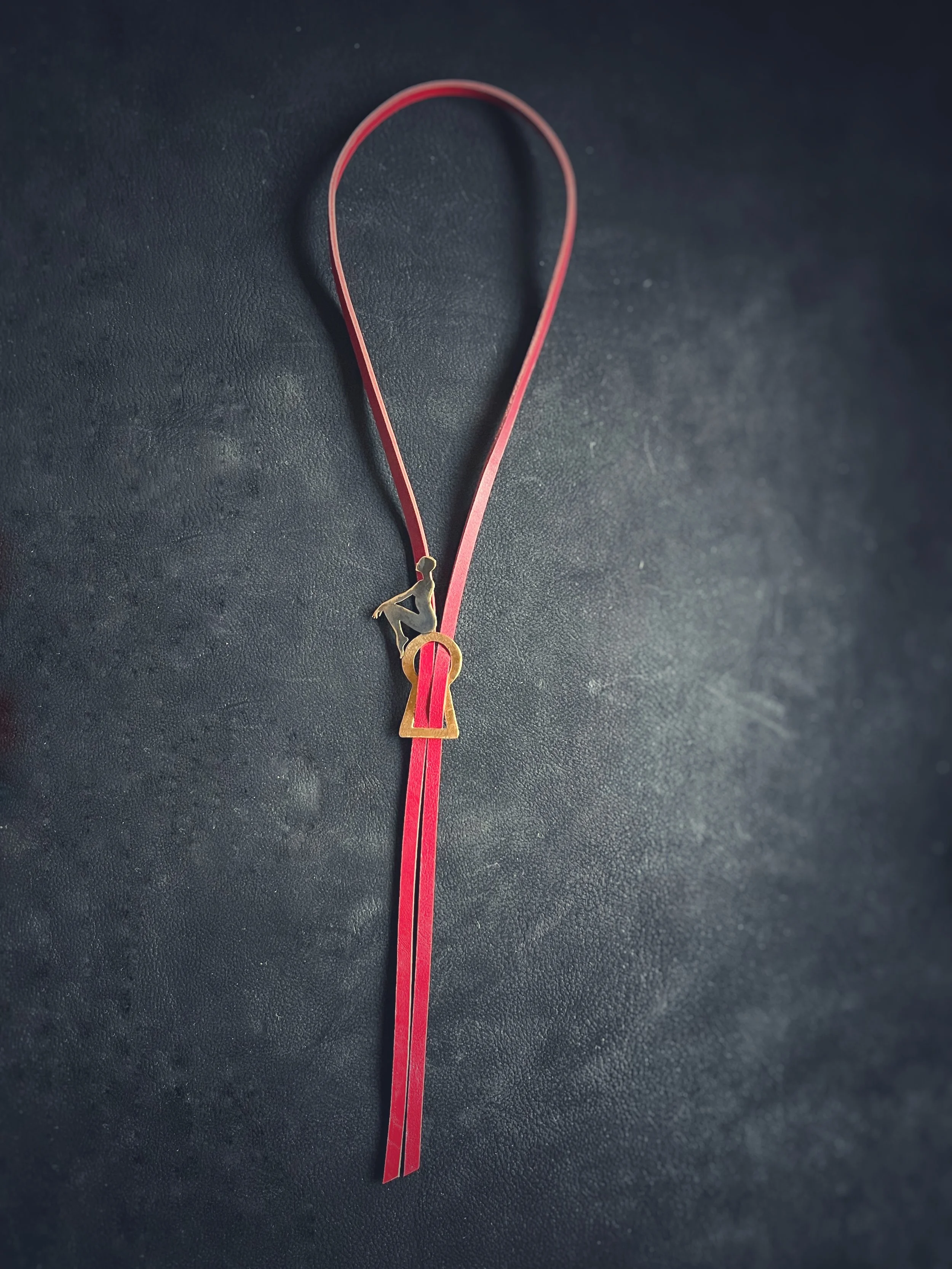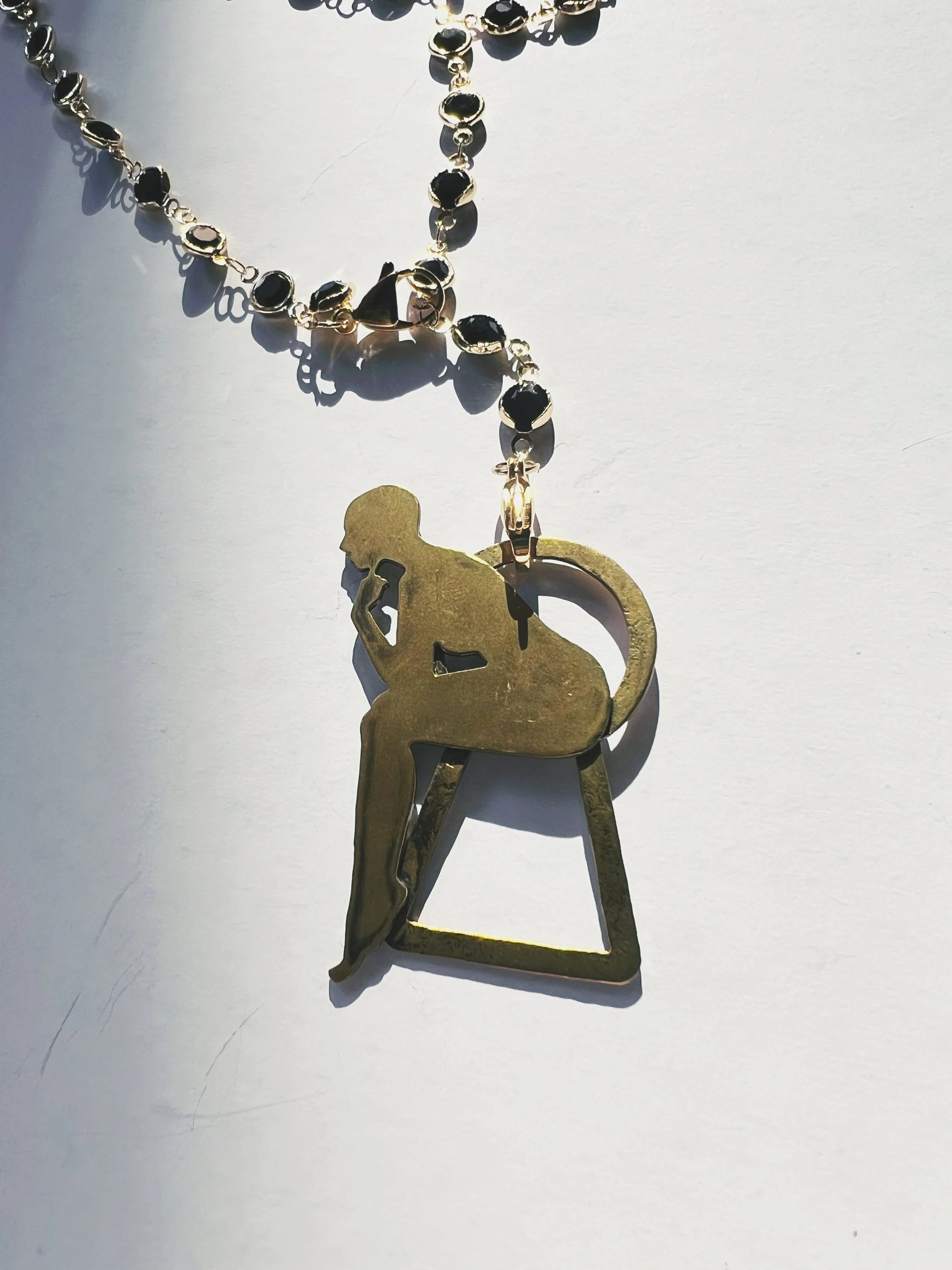 Each figure is hand-pierced, refined, and set into a composition of brass, silver, upcycled leather or dark crystals.